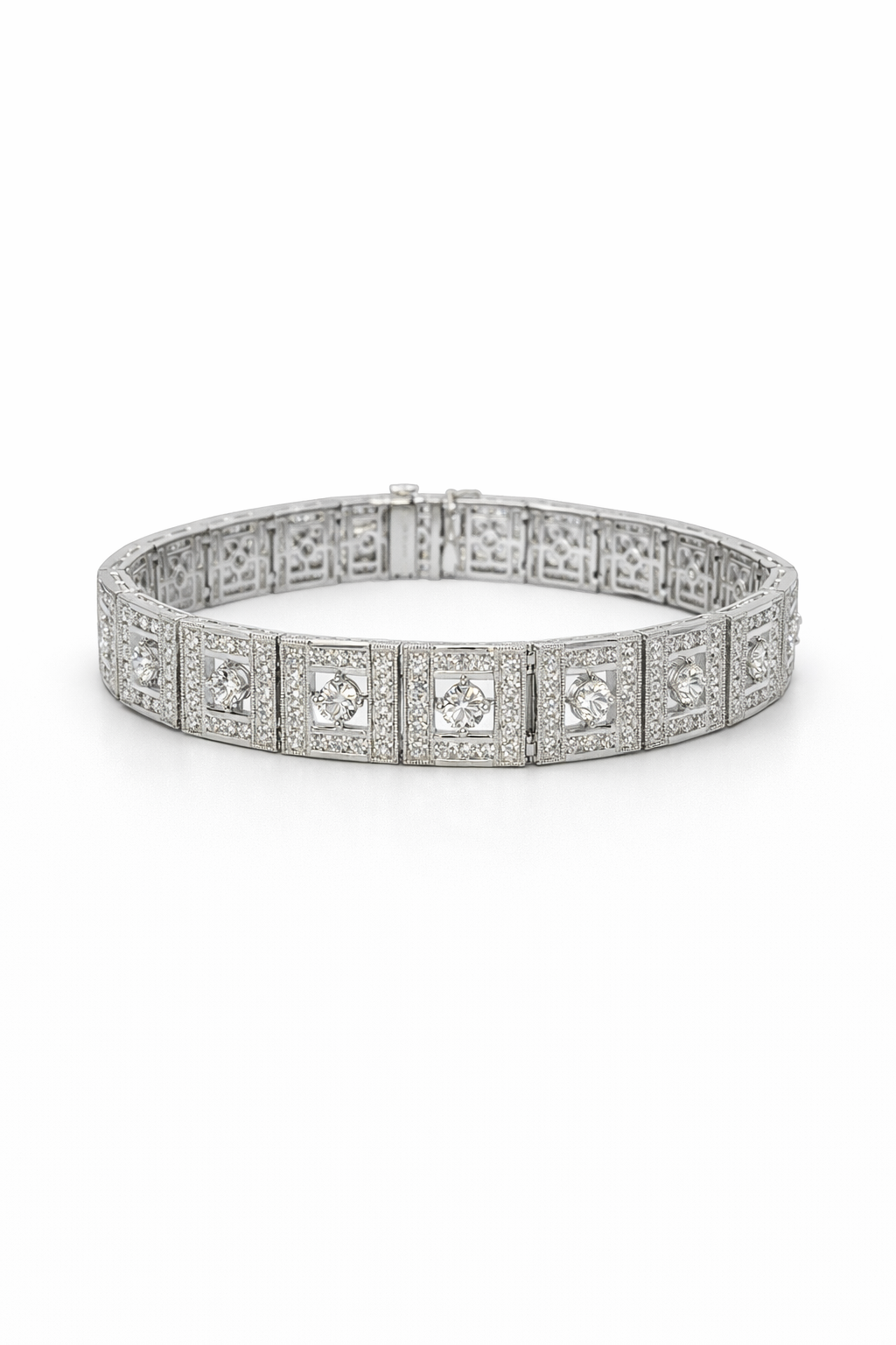 14K WG TENNIS BRACELET 319RD 8.28CT LONG: 7 INCHES. PRINCESS CUT SAPPHIRE REPLACE WITH CHANNEL SET WHITE RD DIAMONDS. MILLGRAINED, BACKING. 20x5 LINKS = 100RDS + 16x7 LINKS = 112RDS + 7RDS PRONG SET + 20x5 LINKS = 100RDS DIA 8.28CT