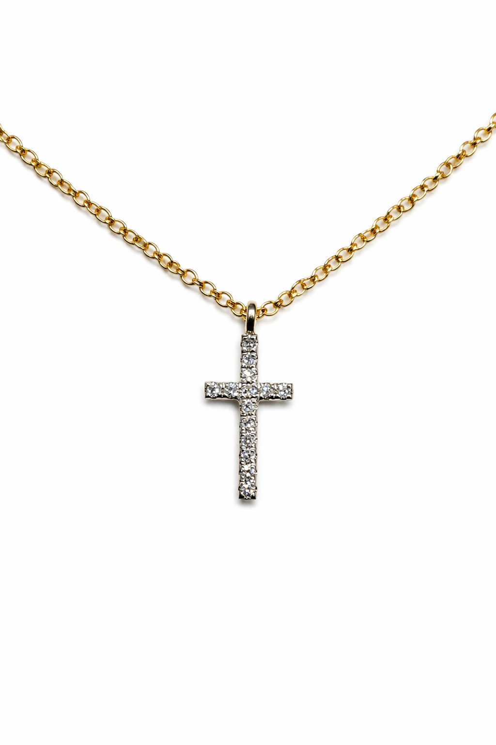 14K WY CROSS NECKLACE 14RD DIA 0.05CT SINGLE CUT DIAMOND NECKLACE. SECTION THAT HOLD DIAMONDS SET IN WG CHAIN IN YG. CHAIN LENGTH: 15-INCHES WITH 2-INCHES EXTENSION