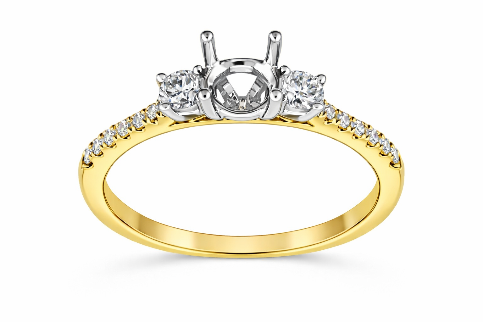 14K WY RING 14RD 0.39CT CENTER 4 PRONG HEAD 5.0MM RD; CENTER WHOLE 4 PRONG HEAD & SHOULDER WHOLE 4 PRONG HEAD IN WHITE GOLD; THE REST OF THE RING IN YELLOW GOLD SET WITH WHITE DIAMONDS; 2RD SIDE STONES 6x2 = 12RDS DIA 0.39CT PRONG HEAD