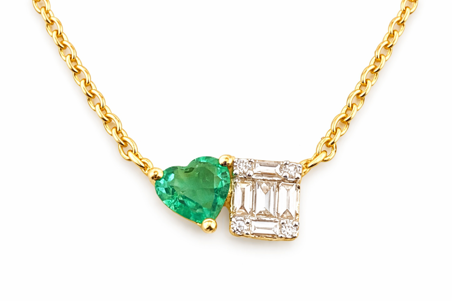 14K Y NECKLACE 4RD 0.02CT 5BG 0.11CT 1EM0.23CT NECKLACE SET WITH DIAMONDS & HEAR SHAPE EMERALD. CHAIN LENGTH 15+1.5+1.5 INCHES DIA 0.02CT BG 0.11CT EME 0.23CT