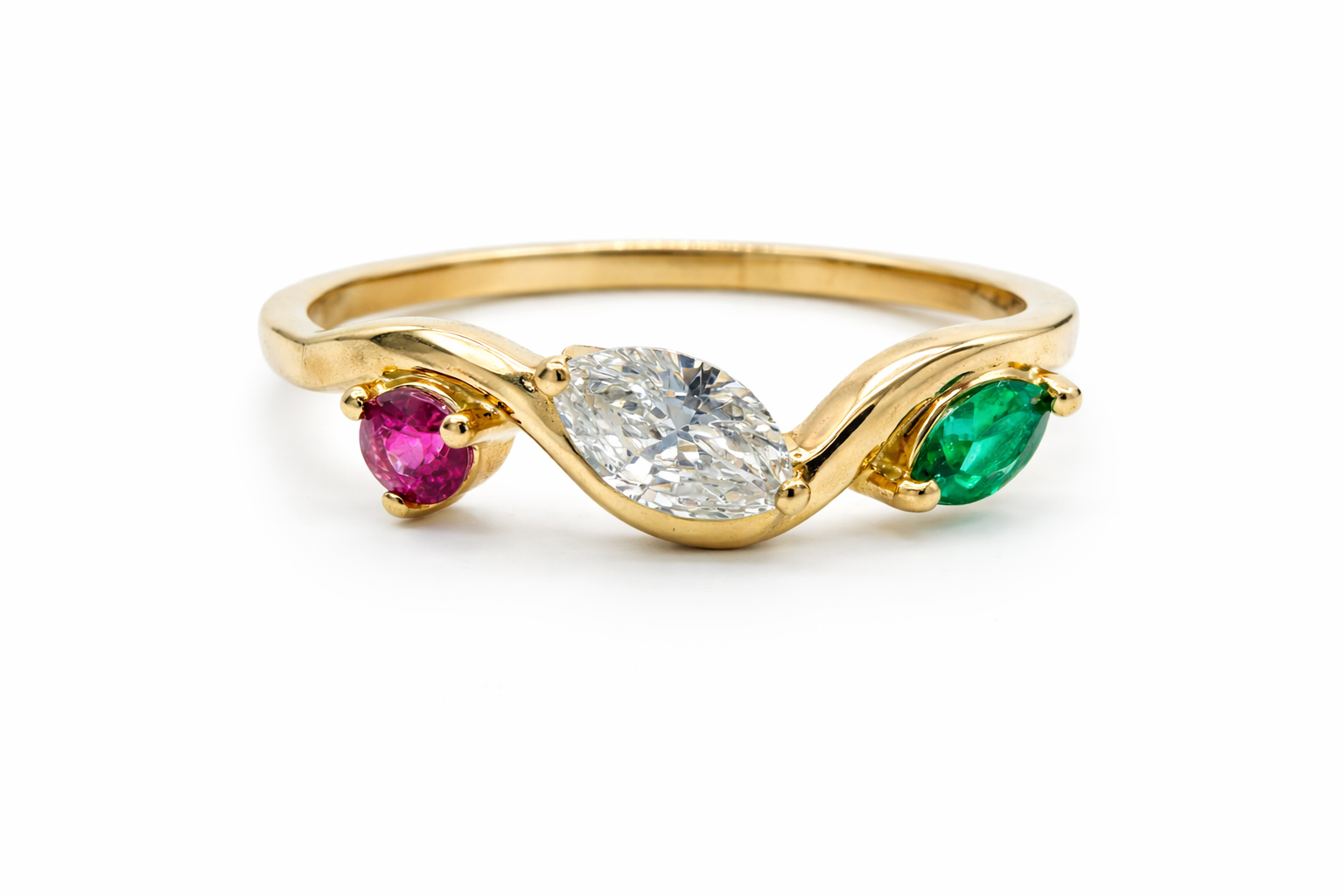 18K YG RING GTW 0.27CT CERT DIA 0.12CT RUB .06 CT EME 0.09CT MEMO