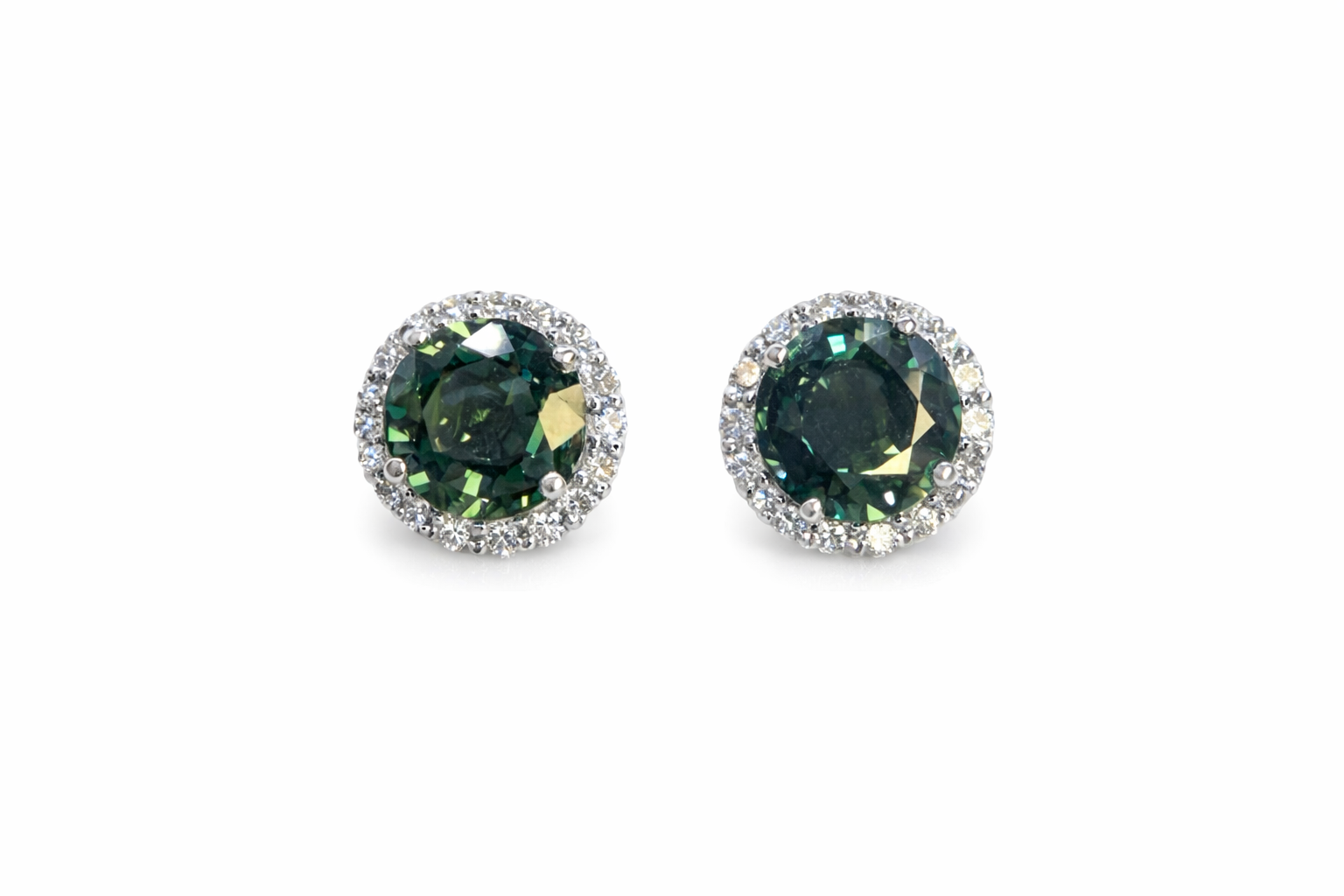 EARRING 14KW SAPPHIRE TEAL RD 7 mm SAPP: 2pcs = 3.81cts DIA: 28pcs = 0.60cts